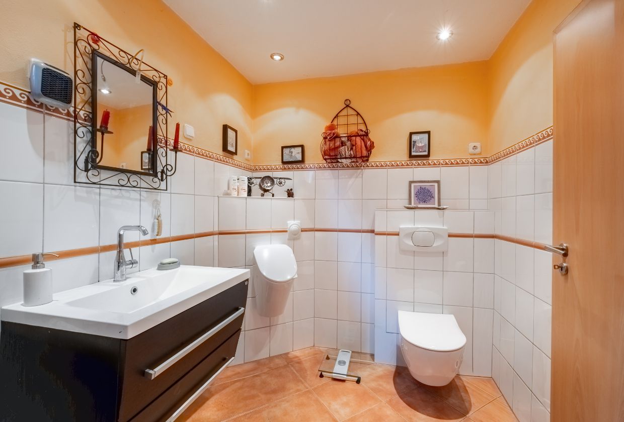 Die Bäder der Doppelhaushälfte präsentieren sich modern, gepflegt und funktional. Im Obergeschoss erwartet Sie ein helles Duschbad mit zeitgemäßen Armaturen und klarer Linienführung. Das großzügige Vollbad im Untergeschoss bietet mit Badewanne und zusätzlicher Dusche einen angenehmen Wohlfühlkomfort.
