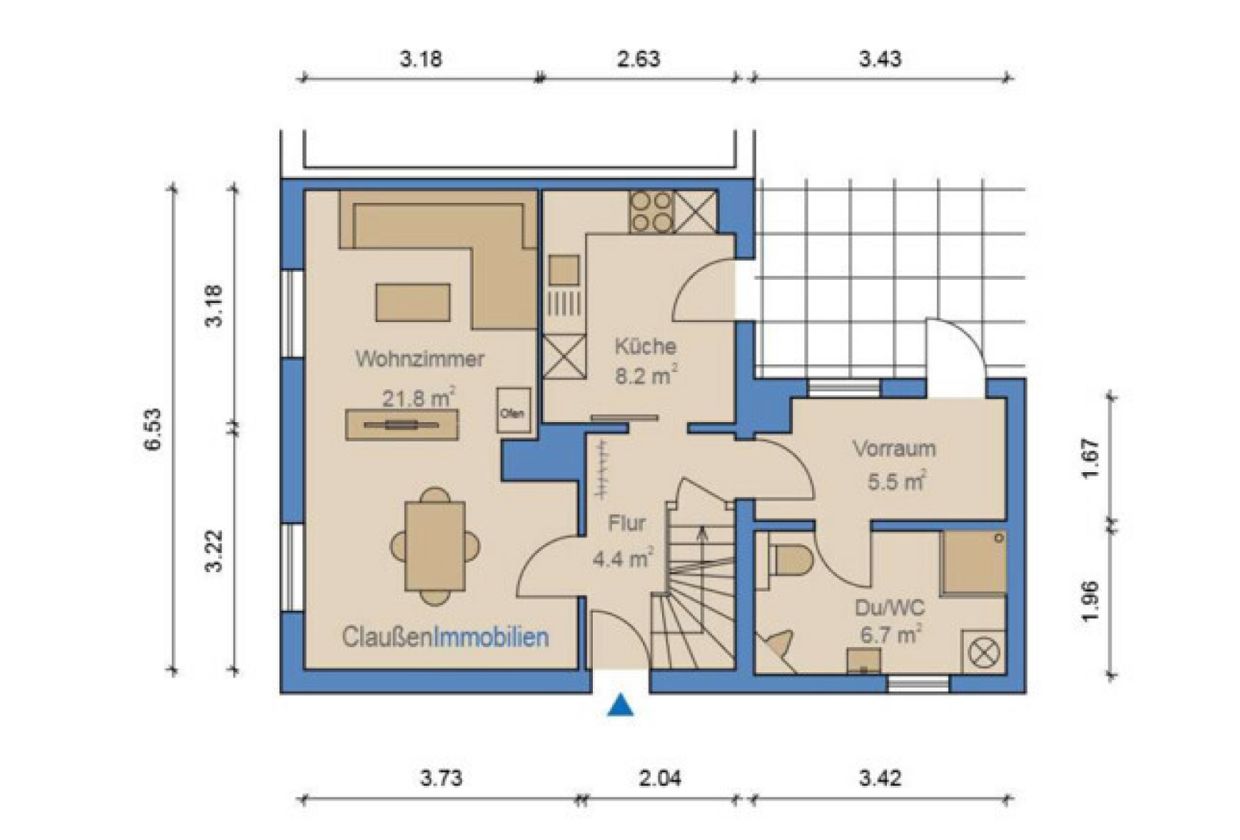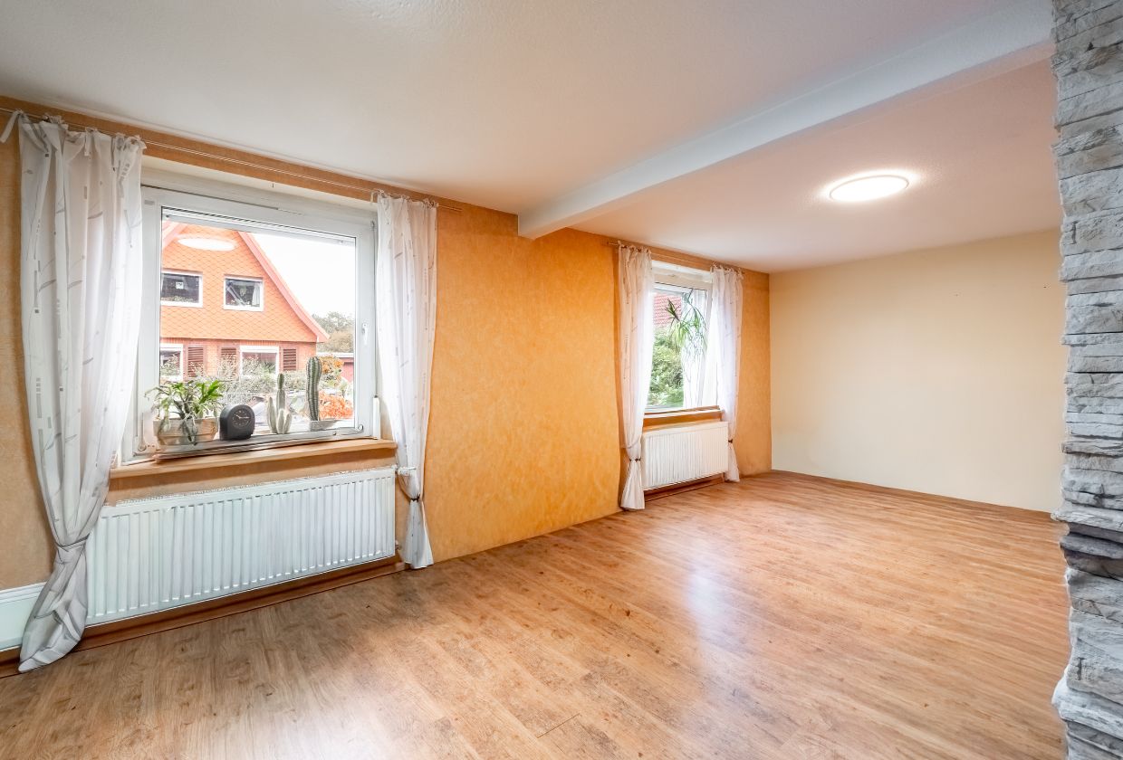 Das Wohnzimmer im Erdgeschoss ist hell, gemütlich und hat einen Kaminofen, der an kühlen Tagen für eine warme Atmosphäre sorgt. Die Raumaufteilung bietet Platz für eine Sitzecke und einen großzügigen Essbereich. Durch die angenehme Helligkeit und den Blick in den Garten entsteht ein Wohngefühl, das sofort Ruhe und Zuhause vermittelt.