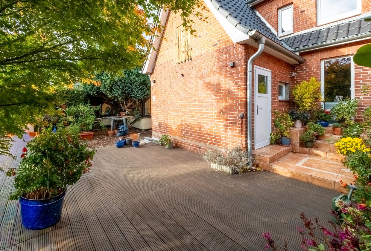 Die Terrasse wirkt wie ein kleiner Wintergarten, sie verbindet den Innenraum harmonisch mit dem weitläufigen Garten und lädt zum Verweilen ein: ob als gemütlicher Leseplatz, Treffpunkt mit Freunden oder Ort für entspannte Stunden zu zweit. Durch die geschützte Lage lässt sich die Terrasse vom Frühjahr bis weit in den Herbst hinein optimal nutzen.