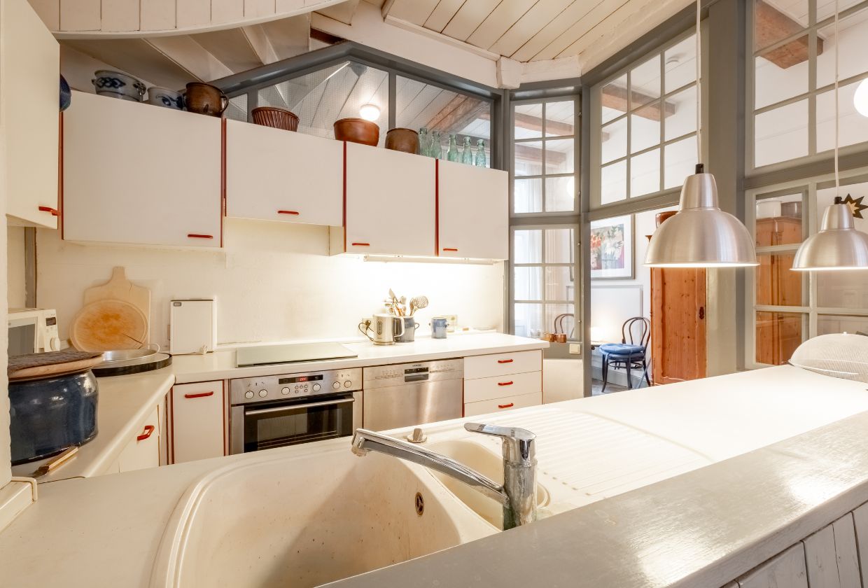 Die offene, helle Küche ist direkt über den Flur erreichbar und überzeugt durch ihre großzügigen Fensterflächen, die viel Tageslicht einlassen und den Altbaucharakter wirkungsvoll hervorheben.