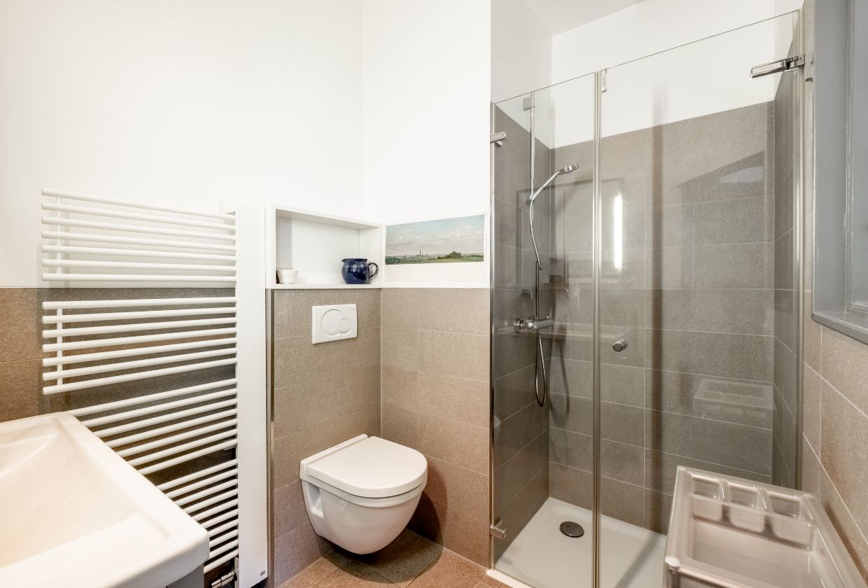 Das Badezimmer im Obergeschoss wurde bereits modernisiert und verbindet zeitgemäße Ausstattung mit historischem Ambiente. Helle Materialien und eine angenehme Raumaufteilung sorgen für ein komfortables Nutzungserlebnis. Ergänzt wird der Raum durch eine großzügige Walk-in-Dusche sowie eine Handtuchheizung, die zusätzlichen Komfort bietet.