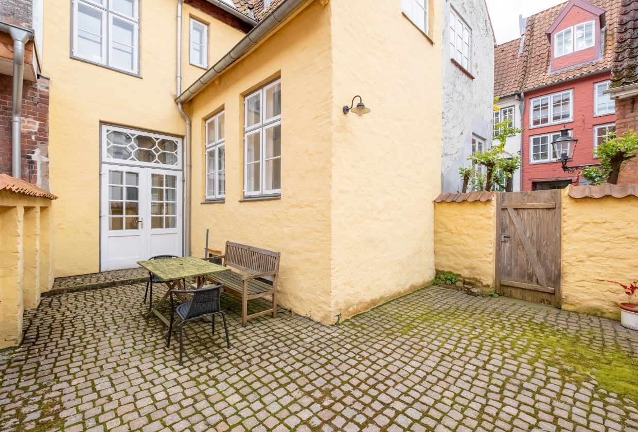 Die großzügige Terrasse mit Nord-West-Ausrichtung ist ein seltenes Highlight in der Lübecker Altstadt. Sie bietet wertvollen Außenraum in zentraler Lage und eignet sich ideal für erholsame Momente im geschützten Freien.
