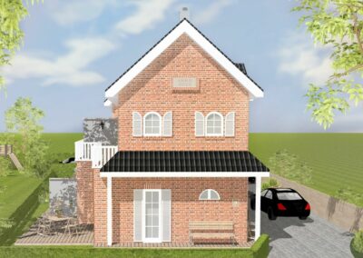 Bei diesem Projekt zeigt sich die enge Verbindung zur Region in jedem Schritt, von der ersten Entwurfsidee bis zur Zusammenarbeit mit örtlichen Baufirmen und Handwerksbetrieben. Das Gebäude entsteht in klassischer Massivbauweise und erhält mit dem roten Klinker, den liebevoll gestalteten Erkern und den weißen Fenstern eine typisch norddeutsche Architektur. Es entsteht ein zeitloses Erscheinungsbild, das sich harmonisch in die Umgebung einfügt und seine Wirkung viele Jahre behalten wird.