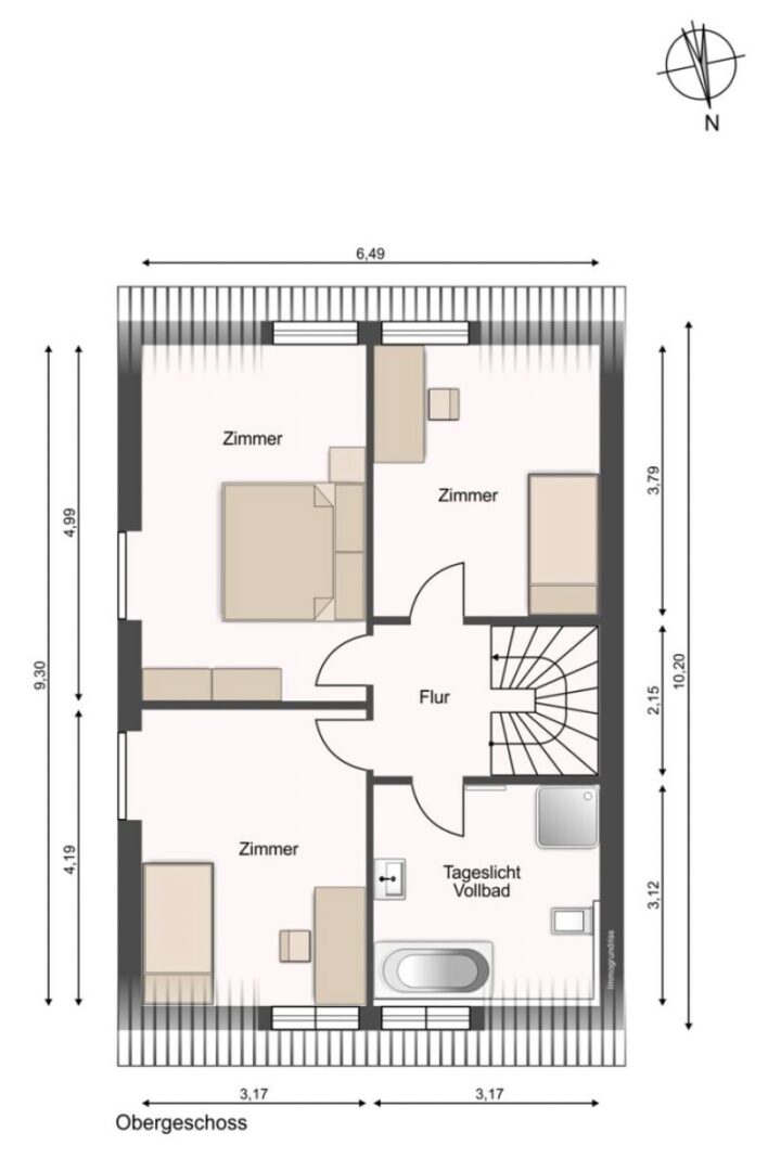 Die drei Schlafzimmer im Obergeschoss sind lichtdurchflutet und sehr angenehm geschnitten. Große Fenster lassen viel Tageslicht herein, sodass die Räume stets freundlich und einladend wirken. Jedes Zimmer bietet genügend Platz für ein Doppelbett, Schränke oder einen Arbeitsbereich.