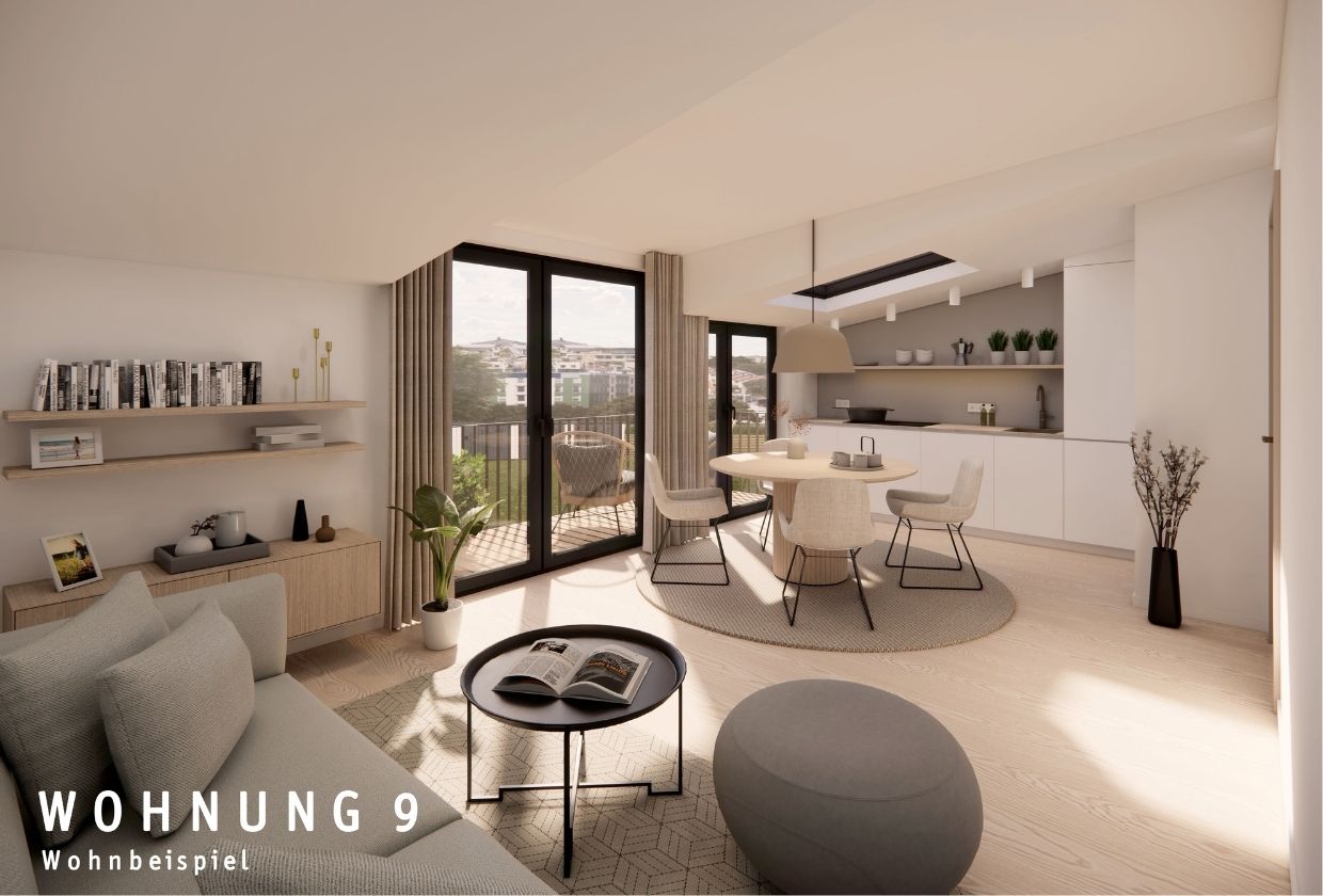 Dieses Wohnbeispiel zeigt, wie modern und leicht das Wohnen unter dem Dach wirken kann: Ein offener Wohn- und Essbereich, der mit klaren Linien und großzügigem Raumgefühl überzeugt. Die helle, zweiflügelige Balkontür lässt reichlich Tageslicht einströmen und verbindet das Innere harmonisch mit dem Außenraum. Dezente Materialien und eine klare Farbgestaltung schaffen eine Atmosphäre, die sowohl Ruhe als auch Leichtigkeit ausstrahlt.